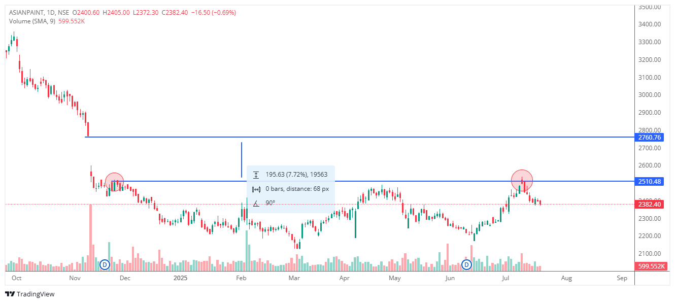 In early July, ASIANPAINT rallied once again to test ₹2,510. Although the breakout attempt looked strong, the price couldn’t hold above it. It reversed shortly after, marking a failed breakout. - Volume Confirmation